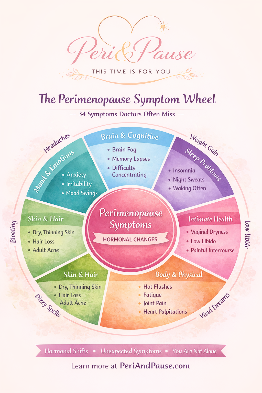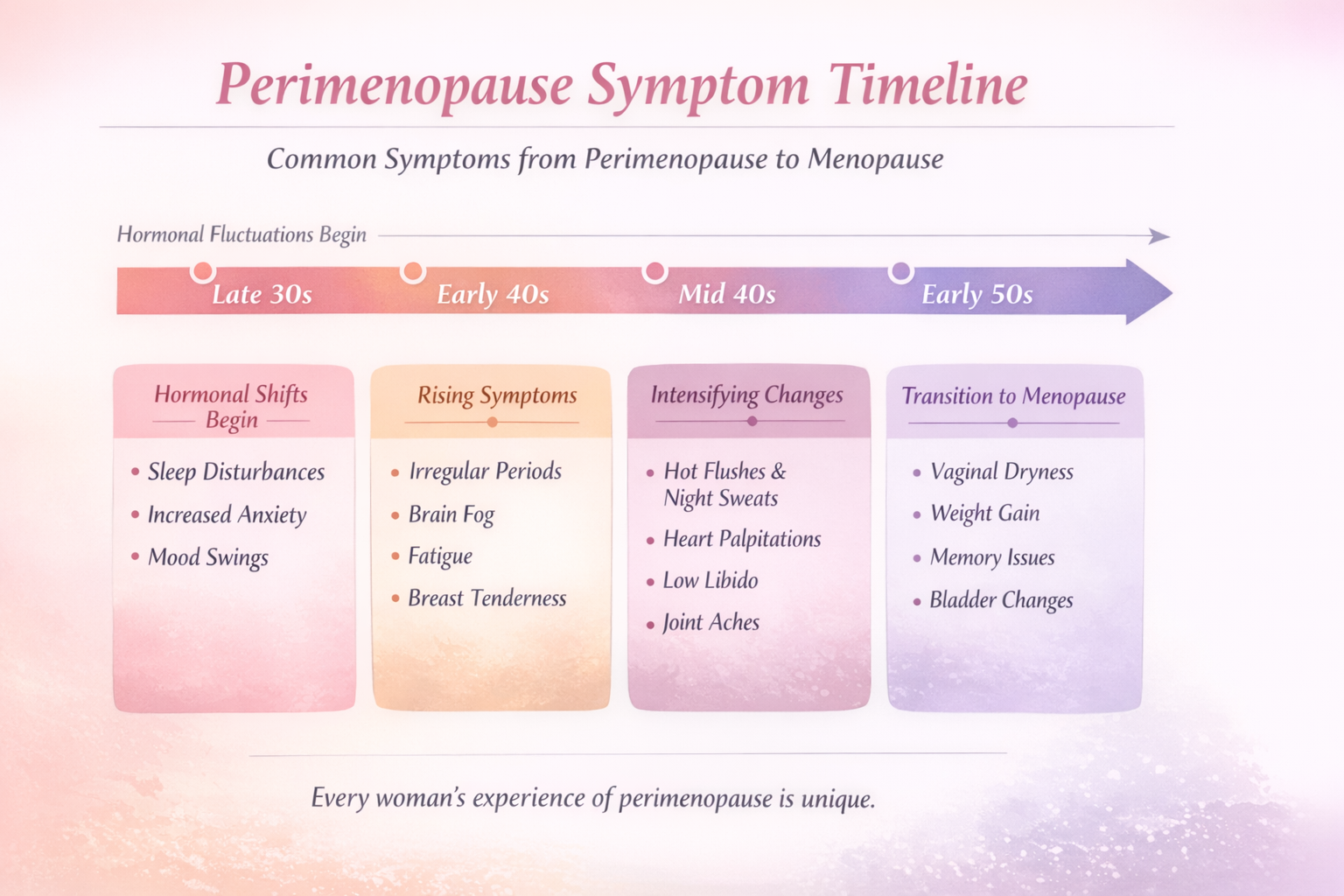 Symptoms can appear gradually and may change over time as hormone levels fluctuate.